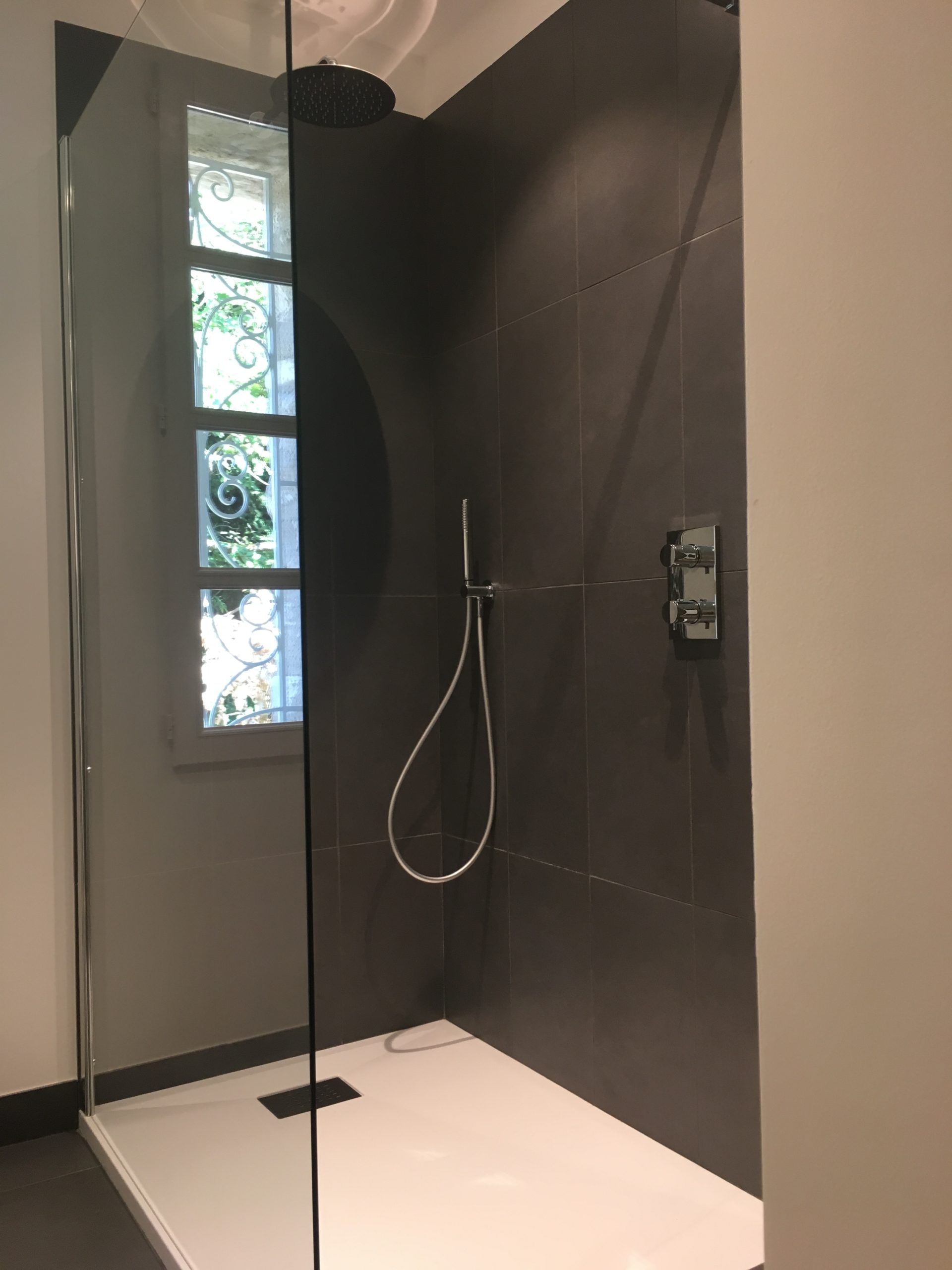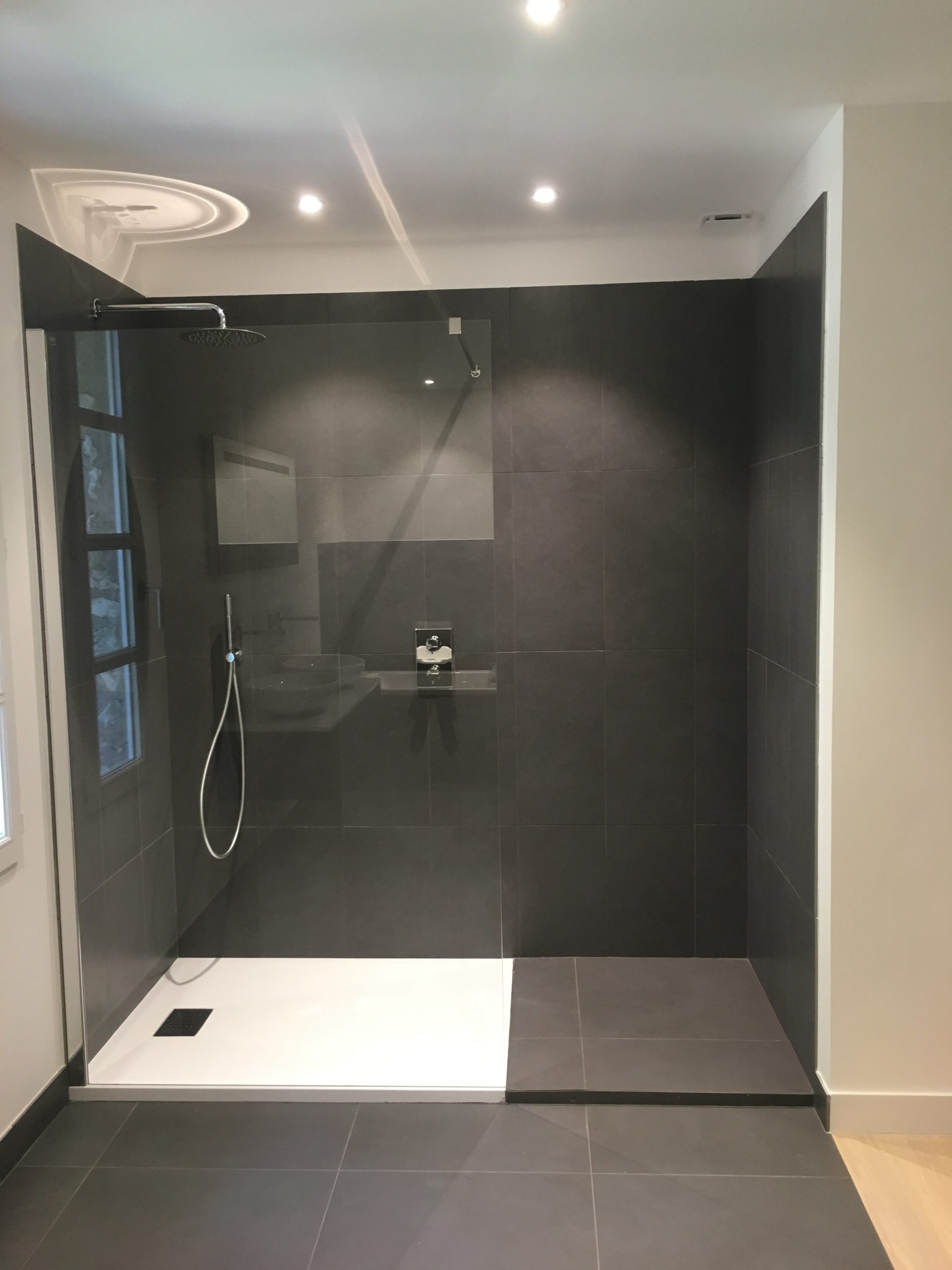 Zoom sur cette salle de bain au look noir et blanc, rénovation complète plomberie & électricité !