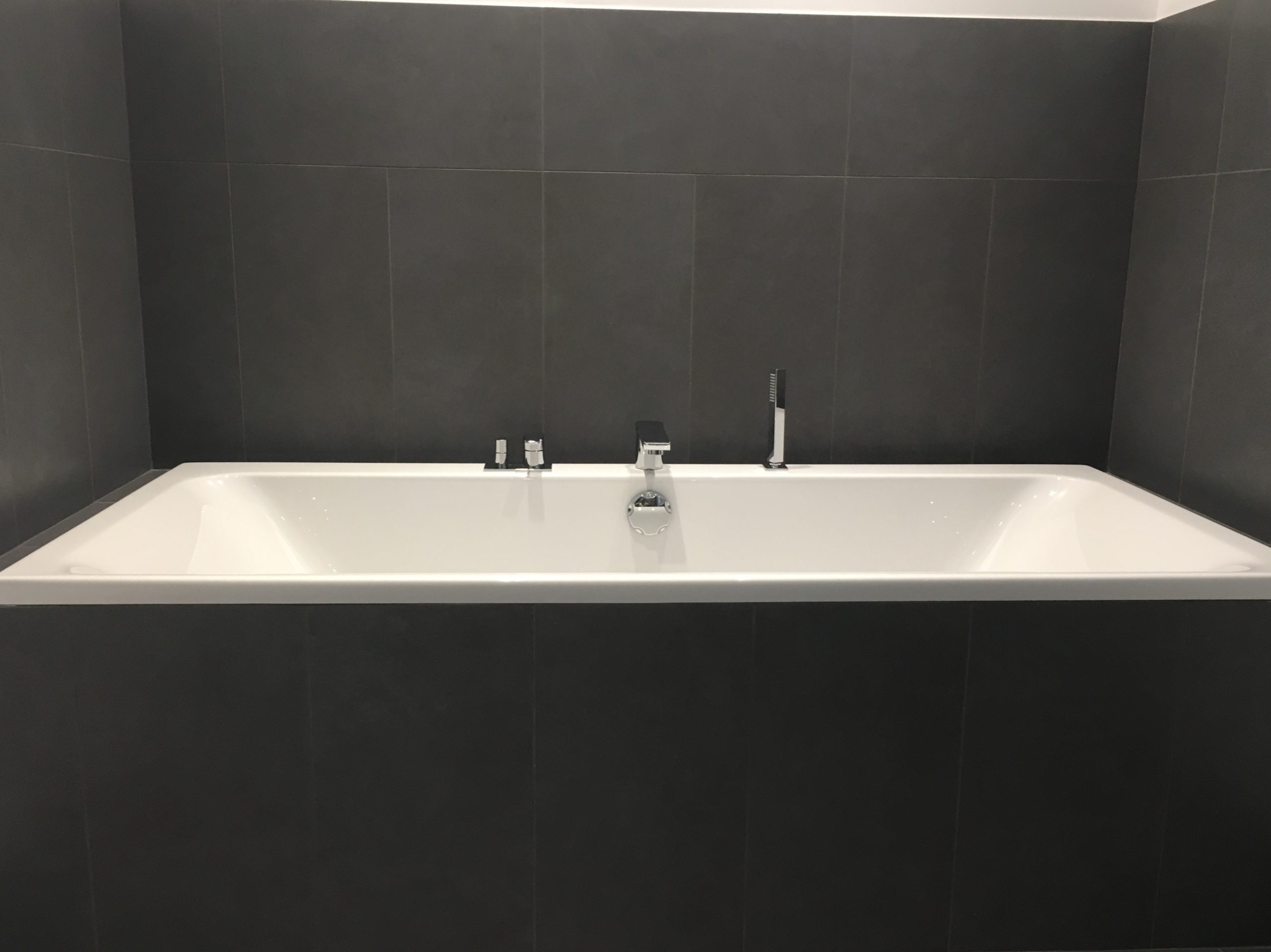 Baignoire acrylique en niche équipée d’une robinetterie sur plage avec stylet de douche extractible